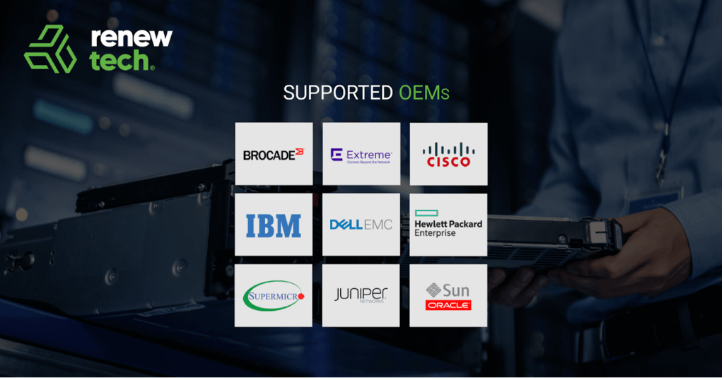 Renewtech tarjoaa maailmanlaajuista kolmannen osapuolen huoltopalvelua useiden johtavien alkuperäisten laitevalmistajien verkko-, palvelin- ja tallennuslaitteistoille, jotka näet alla olevasta yleiskatsauksesta. Olipa kyseessä sitten langaton tukiasema, kuitukanavakytkin tai verkonohjain, jonka alkuperäinen takuu on päättynyt, Renewtech tarjoaa maailmanluokan tukea ja huoltoa näille OEM-valmistajille.